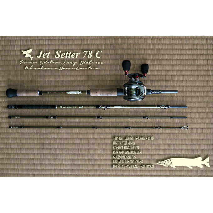 jet-setter* ジェット族。世界のどこへでも、せわしなくジェット機で飛び回り、好きなアクティビティのために旅をする人々。 JetSetter.. are old-fashioned rich and fashionable people who travel a lot ! JetSlow×TULALA JetSetter78C Power edition,Long distance BAITCASTING ROD FOR THE MONSTER* FRESH WATER. 5ピースからスタートして、強度とキャスト精度をあげるために4ピースに大改造。いくつかのバランスとり、調子、硬さを世界のどこでも通用するように、現場でテストしてきたパックロッドです。トラベルロッドとして、コンパクトにまとまる行儀の良い竿として、いつでも一緒にいられる釣り具として。 遠いヒョウテキ、広いフィールドをしなやかに曲げて撃つために。 キャストする、ウエイトのストライクゾーンは幅広く、7~80グラム。 100グラムオーバーのものまでをキャストできる体幹は、対峙可能であるターゲットサイズを10キロオーバー、15、20キロまでに。 使用ラインはPE5号クラスまで。 太い道糸とリーダーのシステムの通りの良さ、モンスターとのやりとりを考えた大径ガイド、脇にしっかりと挟んでルアーやリグをコントロールしアワセとファイトをするためのロングサポートグリップを装備します。 78Cは釣り人の夢に近づける、頼もしさと、しなやかな強さを持つロッドです。 あなたが釣りたい魚はなんですか? どこに行きたくなりましたか? いよいよ、大物と対峙する時が来ます。 または標的が遠い時。1オンス超、5オンスまでのウエイトのルアーを投げねばならない時。 旅に連れて行ける、荒野の用心棒が彼です。彼はズバリ、ズバババッ! と斬っていきます。 完全に、ほとんどの、ウエイトのルアーウエイトを乗せて、渾身の力で、空を斬るように振り抜ける快感。 「ぶわおん」「ブンッ!」 次々と、遠い場所へ正確にルアーを飛ばす様は、中世の投石機(カタパルト)のよう。 7フィート8インチというレングスと、しなやかで強い筋肉。 アフリカ、南米、モンゴル、日本全国、カナダ、アラスカで鍛えた体は、すべての釣りをする旅人、それはロングトリップでもショートトリップでも、頼もしい相棒となるでしょう。 どこへ旅をするか、どんな釣りをするか、なにを釣るか。 「青い空に一直線に飛んでいくルアー。ロンググリップを脇にはさみ。確かな手応えのあと、もだえるように跳ねる白い飛沫。緊張感をもって応戦する、そして、ぐいぐいと引き寄せる黄緑のロッドカーブ。」 そのとき、あなたは。 Ford,Every Stream. ■付属品:セミハード・ロッドケース68 ■長さ/仕舞い寸法:7フィート8インチ(234cm)/64cm ■ロッドタイプ:ベイトキャスティングロッド ■ルアー:オールラウンド。7~80gのミノー、トップウォーターなどすべて。 ■自重:約194g ■使用ライン:-5合PE推奨、モノフィラ20ポンド ■推奨リーダー:-80ポンド ■ロッドクラス:MH-H※グラスコンポジット ■狙う魚:15キロまでをテスト済 ※メーカー取り寄せ商品の為、通常よりも納期がかかります。※取り寄せ商品の為、キャンセル・返品不可となります。※メーカーの在庫状況によっては商品をご用意出来ない場合がございます予めご了承ください。検索ワード:つり アウトドア フィッシング 川 魚 趣味 竿 つりざお