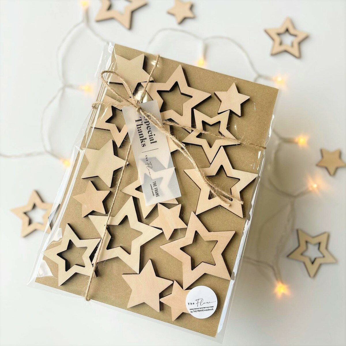 スターバナーセット 星 レターバナー 16個セット 木製バナー 星型レターバナー 七夕飾り 天の川 クリスマス クリスマスフォト 七夕フォト 七夕祭り 七夕フォトアイテム レターバナー セット 寝相アート 【スターバナーセット】 新商品 スターバナーセット!七夕や誕生日、クリスマスのフォトアイテムに!! 新商品!!星のバナーが16個セットで新登場! 星の形の木製バナーが16個セットになりました!!4種類の大きさと形があり、それぞれ4個ずつセットになっています。七夕フォトやクリスマスフォトにおすすめ!そのほかにもニューボーンフォトやバースデーフォトの飾りとして、または子供部屋のインテリアとしても!▼商品説明▼サイズ星(M):約H4.8cm×W5cm 星(S):約H3.8cm×W3.7cm星(型抜きM):約H7.2cm×W7.4cm 星(型抜きS):約H5.8cm×W6cm各サイズ 4個入り厚み:約5.5mm 材質:木材(合板)無塗装仕上げ 当店はすべてオリジナル商品!! 家具工房にて直販の為、オーダーなのに低価格! プレゼントに最適!すべて簡易ラッピングをします! 木の温もりある雑貨が好きな方 一味違う贈り物をしたい方 おうちフォトを楽しみたい方 ※ご購入前にご一読ください。▼当店のこだわりについて▼全ての商品を個包装の簡易ラッピングにてお送りしております。贈り物を開ける瞬間の“わくわく”をみなさまにお届けいたします。全て自社工房にてお作りしたオリジナル商品を販売しております。▼製品の仕上げ、衛生面への配慮▼当店の木製製品は、レーザー加工機により加工を施しております。加工の際に焦げやすすが付着しますが、独自の洗浄方法にて丁寧に洗浄と消毒をした後、乾燥、研磨、エアー洗浄をしてから検品してお客様のもとへお届けいたします。また、厚みのある木材を使用することにより、強度が高いのも当店の製品の特長です。▼納期について名入れ商品は14営業日以内に出荷(予備日含む)、名入れ以外の小物商品は3営業日以内に出荷しております。▼レビューについてお客様の声を今後に生かすため、商品レビューのご記入をお願いしております。商品レビューをご記入いただきましたら、当店オリジナルミニ木製小物をプレゼントいたします。▼注意▼モニターの発色により、実物と異なる場合があります。本製品は天然素材を使用しており、木目や節があり色目にばらつきがあります。時間が経過することにより木材の断面等にトゲやささくれ等が発生する恐れがあります。加工による焦げから多少においが残っている場合があります。水濡れや湿気の多い状態でご使用されますと破損や変形の原因になり、カビが発生する恐れがあります。水濡れや湿気の多い状態でご使用や保管をされますと変形したりカビが発生する恐れがあります。本製品が汚れてしまった際には、乾いた布でふき取って下さい。先端部分が尖っていることがありますので、ご使用の際には十分注意していただき、小さなお子様のお手に触れないようにご使用ください。 3営業日以内に出荷1