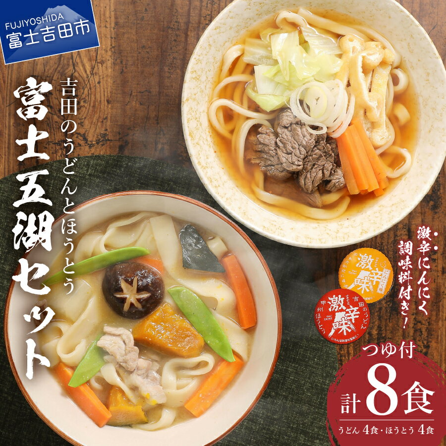 【 ふるさと納税 うどん 】小麦粉は希少価値のある山梨県産小麦粉使用し、麺道一筋の職人が天然塩、富士山の湧水で練り上げました。【ふるさと納税】うどん 富士五湖セット 吉田のうどん ほうとう 各4食 計8人前 つゆ付き すりだね うどんセット 生麺 8食 うどん 富士吉田名物 辛味2種付き ご当地グルメ 太麺 郷土料理 山梨 富士吉田 吉田のうどん ほうとう うどん 5000円 5000