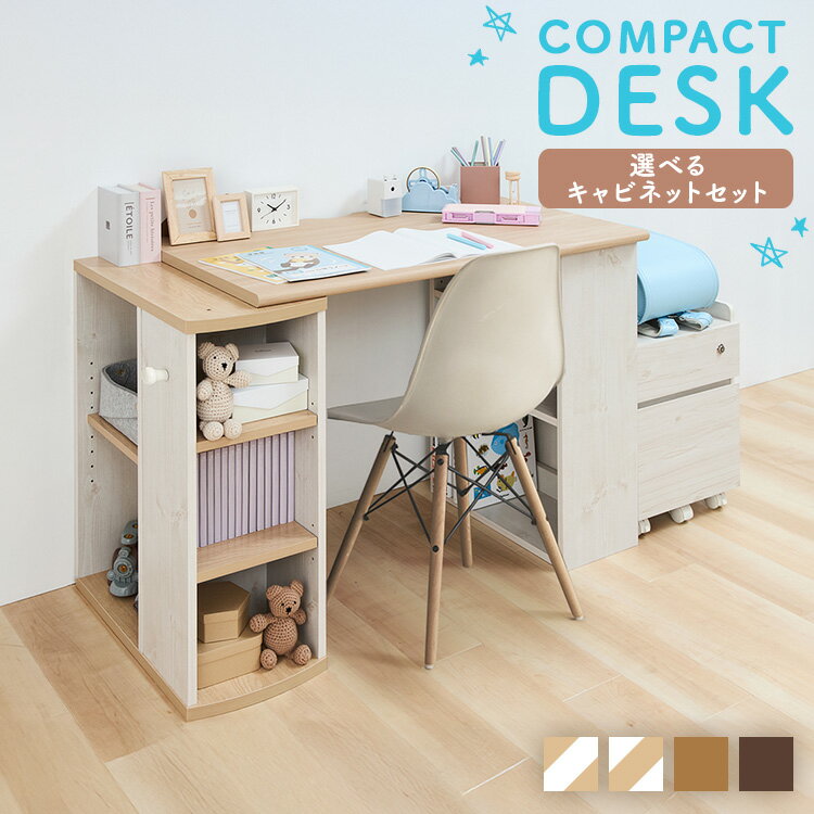 コンパクトデスクのみ、またはコンパクトデスク+キャビネットのセットを選べます。◇コンパクトデスク2種類のラックに、教科書や文房具などをお片付けできる収納付きデスクです。教科書やノートを広げても手狭にならない、ひろびろ天板。天板は傷や汚れに強い塩ビ化粧繊維板を採用しているので、お手入れ簡単です。コード穴があるのでデスク周辺もすっきり、壁にピッタリ設置できます。大人になっても使える、シンプルで飽きのこないデザインです。◇キャビネット1段目は鍵付きの使い勝手の良いキャビネットです。収納するものによって使い分けられる2段の引き出し、厚手の天板はランドセルも余裕で置けるサイズです。キャスター付きなので、移動やお掃除もラクラク。★お客様組立★◇コンパクトデスク●商品サイズ(cm)幅約114.5×奥行約57×高さ約73.4デスク(ラックB込み):幅約100×奥行約57×高さ約73.4ラックA:幅約29×奥行約59.1×高さ約70.9●商品重量約21kg●材質本体:プリント化粧繊維板天板:塩ビ化粧繊維板●耐荷重デスク:天板 20kgラックA:棚 各3kgラックB:棚 各5kg●組立時間めやす約90分◇キャビネット●商品サイズ(cm)幅約35.5×奥行約39.5×高さ約50●商品重量約6kg●材質本体:プリント化粧繊維板天板:塩ビ化粧繊維板●耐荷重(約)天板:10kg上段:3kg下段:7kg●組立時間めやす約40分(検索用:おしゃれ 学習デスク セット 机 キャビネット 子供家具 子供机 脇卓 収納付き 本棚付き 子ども こども リモートワーク 在宅 デスク )最強翌日配送対象商品に関するご案内 最強翌日配送対象商品・対象地域に該当する場合は最強翌日配送マークがご注文カゴ近くに表示されます。 最強翌日配送可能なお支払方法は【クレジットカード、代金引換、全額ポイント支払い】のみとなります。 下記の場合は最強翌日配送対象外となります。 ・15点以上ご購入いただいた場合 ・時間指定がある場合 ・ご注文時備考欄にご記入がある場合 ・決済処理にお時間を頂戴する場合 ・郵便番号や住所に誤りがある場合 ・最強翌日配送対象外の商品とご一緒にご注文いただいた場合 ・お届け先住所文字数が40文字以上の場合 関連キーワード(本商品の説明ではありません)母の日 父の日 敬老の日 こどもの日 クリスマス バレンタイン ホワイトデー ハロウィン お正月 成人の日 成人式 記念日 誕生日 卒業式 入学式 お歳暮 お中元 春 夏 秋 冬 梅雨 節分 ひな祭り 七夕 十五夜 初詣 年越し 夏祭り 花火大会 結婚祝い 内祝い 出産祝い 快気祝い 還暦祝い 古希 喜寿 傘寿 米寿 卒寿 白寿 百寿 新築祝い 引っ越し祝い 開店祝い 開業祝い 就職祝い 昇進祝い 合格祝い 銀婚式 金婚式 七五三 長寿祝い 御礼 お母さん お父さん 義母 義父 祖父 祖母 おばあちゃん おじいちゃん 娘 息子 彼氏 彼女 恋人 友達 上司 先輩 後輩 同僚 キッズ 子供 幼児 ベビー 赤ちゃん 育児 学生 社会人 シニア 10代 20代 30代 40代 50代 60代 70代 80代 90代 一人暮らし 単身赴任 主婦 主夫 新生活 家族暮らし 子育て 旅行 トラベル ライブ ホームパーティ ビジネス 法人 ギフト プレゼント