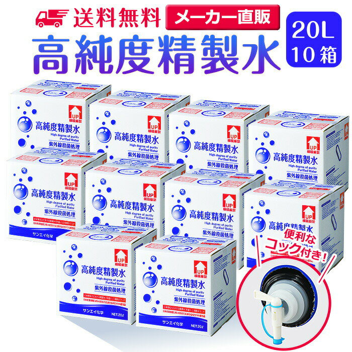 サンエイ化学の高純度精製水は日本薬局方(JP)および日本産業規格(JIS)におけるA2クラスの規格をクリアした製品です。呼吸器や減菌器などの医療用、美顔器や加湿器などの蒸気用水に最適。サンエイ化学 精製水 高純度精製水 20L×10箱セット コック付き 大容量 | 20リットル 無呼吸 無呼吸症候群 CPAP CPAP用 シーパップ 加湿器 アロマ スキンケア 除菌スプレー 除菌水 純水 蒸留水 イオン交換水 超純水 せいせいすい 鼻うがい ナノケア スチーマー 化粧水 日本製
