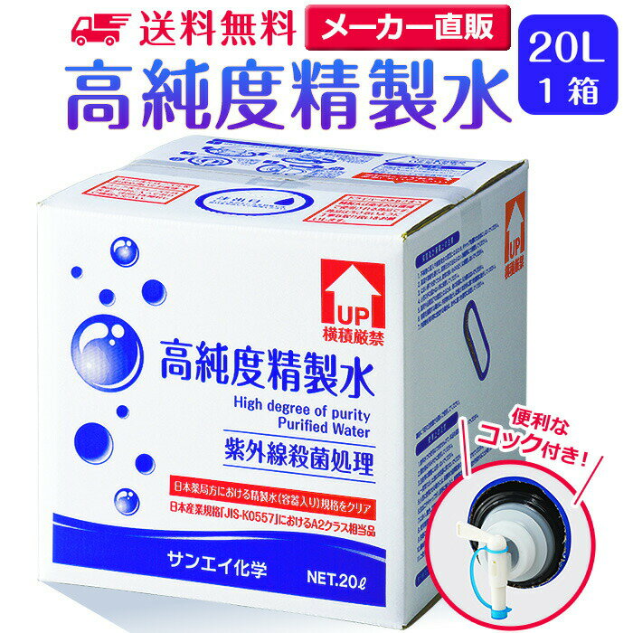 サンエイ化学の高純度精製水は日本薬局方(JP)および日本産業規格(JIS)におけるA2クラスの規格をクリアした製品です。呼吸器や減菌器などの医療用、美顔器や加湿器などの蒸気用水に最適。サンエイ化学 精製水 高純度精製水 20L×1箱 コック付き 大容量 | 20リットル 無呼吸 無呼吸症候群 CPAP CPAP用 シーパップ 加湿器 アロマ エステ スキンケア 除菌スプレー 除菌水 純水 蒸留水 イオン交換水 超純水 せいせいすい 鼻うがい ナノケア スチーマー 化粧水 日本製
