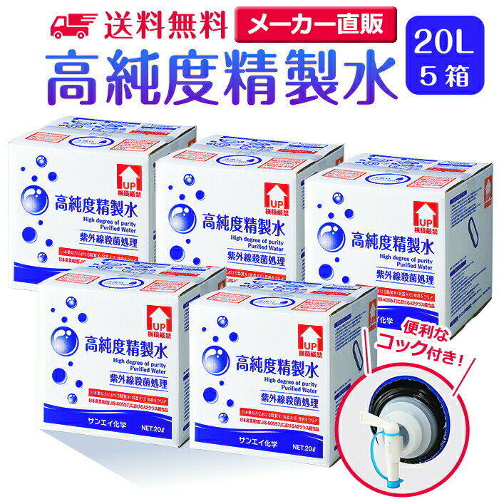 サンエイ化学の高純度精製水は日本薬局方(JP)および日本産業規格(JIS)におけるA2クラスの規格をクリアした製品です。呼吸器や減菌器などの医療用、美顔器や加湿器などの蒸気用水に最適。サンエイ化学 精製水 高純度精製水 20L×5箱セット コック付き 大容量 | 20リットル 無呼吸 無呼吸症候群 CPAP CPAP用 シーパップ 加湿器 アロマ スキンケア 除菌スプレー 除菌水 純水 蒸留水 イオン交換水 超純水 せいせいすい 鼻うがい ナノケア スチーマー 化粧水 日本製