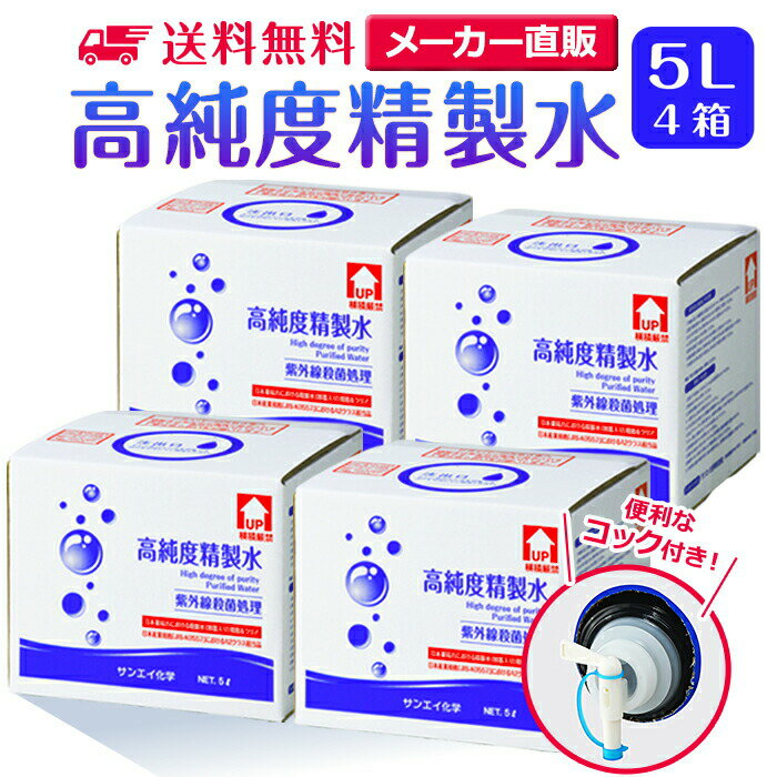 サンエイ化学の高純度精製水は日本薬局方(JP)および日本産業規格(JIS)におけるA2クラスの規格をクリアした製品です。呼吸器や減菌器などの医療用、美顔器や加湿器などの蒸気用水に最適。サンエイ化学 精製水 高純度精製水 5L×4箱セット コック付き 大容量 | 5リットル 無呼吸 無呼吸症候群 CPAP CPAP用 シーパップ 加湿器 アロマ スキンケア 除菌スプレー 除菌水 純水 蒸留水 イオン交換水 超純水 せいせいすい 鼻うがい ナノケア スチーマー 化粧水 日本製
