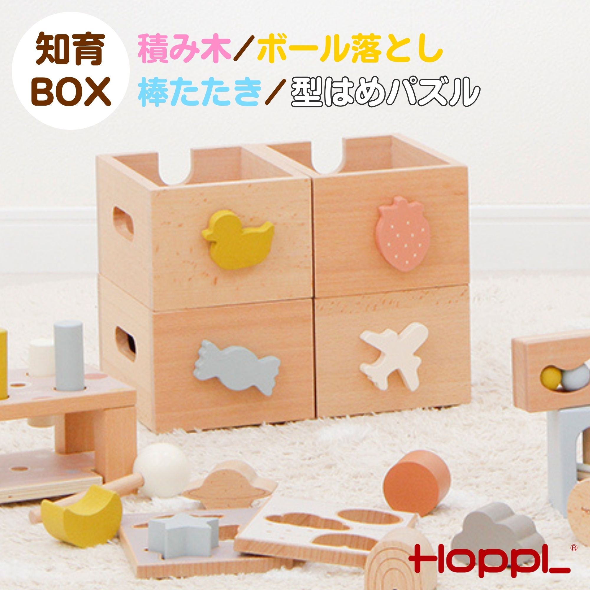 知育 玩具 木製 天然木 型はめパズル 棒たたき ボールたたき ボール落とし つみき スタッキング 指先トレーニング 対象年齢 6ヶ月 1歳 1歳半 2歳 おしゃれ ベビー ギフト 白 ブラウン木製玩具 知育玩具 知育おもちゃ 木のおもちゃ おもちゃ 赤ちゃん スタッキングボックストイ 積み木 パズル ラトル ボール 北欧 いちご あひる キャンディ ひこうき くすみカラー 女の子 男の子 ホップル オシャレ 出産祝い プレゼント 誕生日