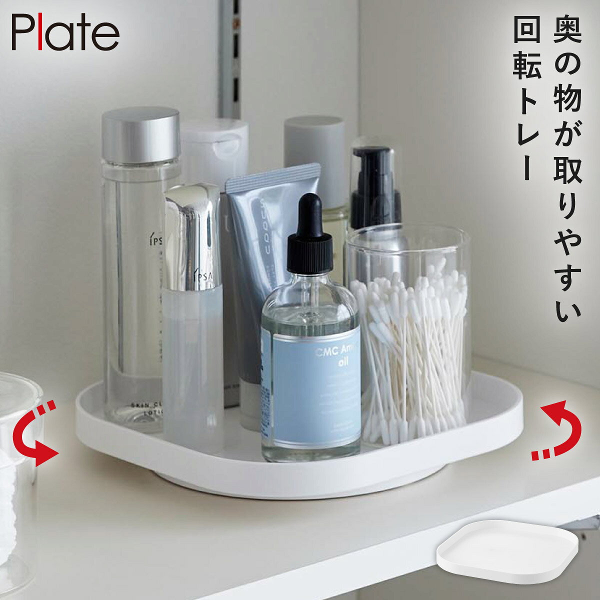 出し入れしやすく使いやすい回転式。調味料などをまとめて収納。回転式収納トレー プレート 山崎実業 plate 洗面台 化粧品 収納 回転 コスメ 冷蔵庫内 収納ラック おしゃれ モノトーン ホワイト 10078