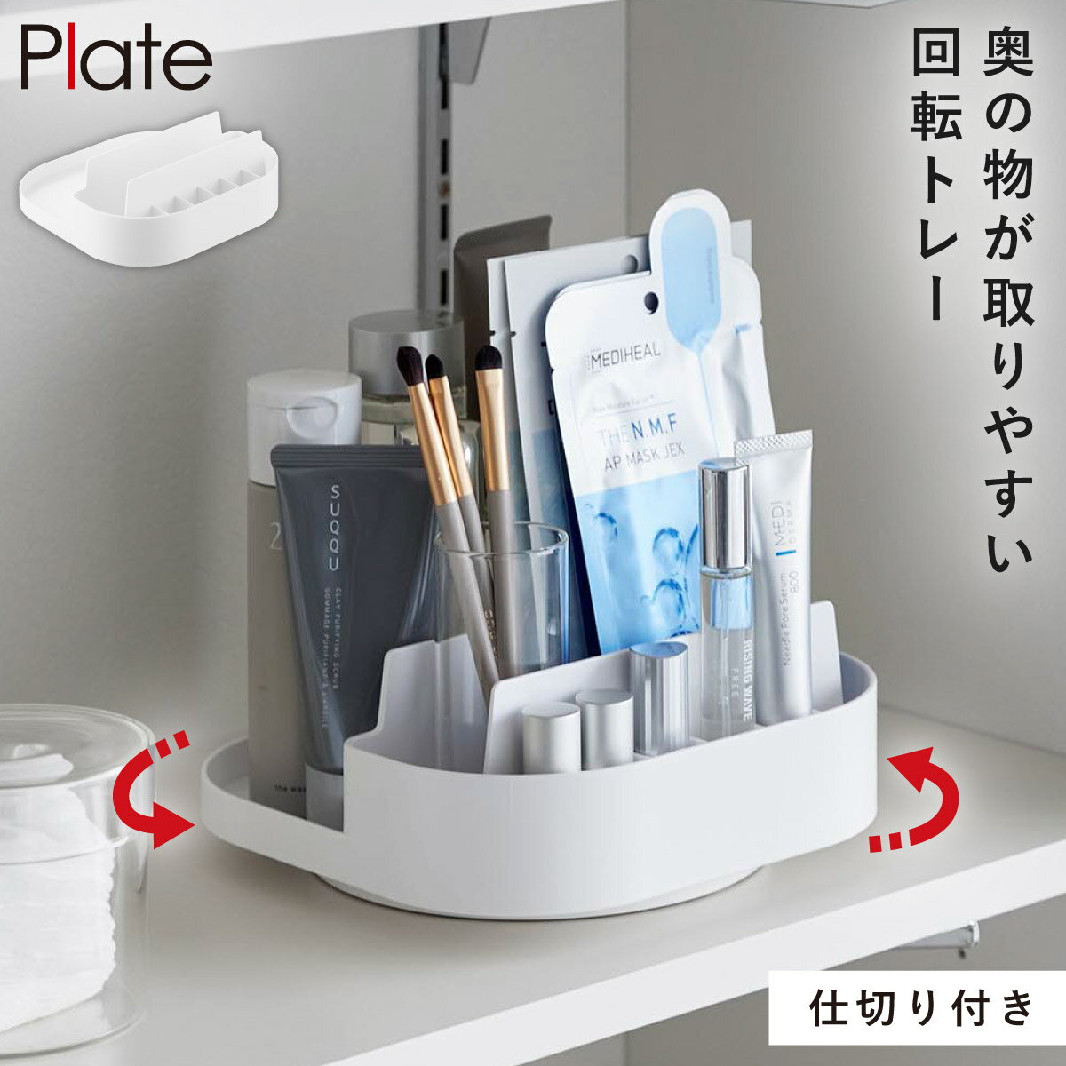 出し入れしやすく使いやすい回転式。調味料などをまとめて収納。回転式仕切り付き収納トレー プレート 山崎実業 plate 洗面台 化粧品 収納 回転 コスメ 冷蔵庫内 収納ラック おしゃれ モノトーン ホワイト 10079