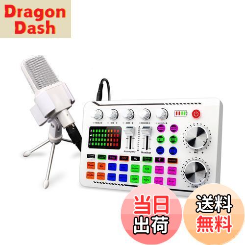 商品情報商品の説明主な仕様 【一台で完了&操作簡単】F998 DJ ミキサーは、オールインワンポータブルオーディオミキサーセットです。ライブ配信を簡単に始めてみたいけどどんなデバイスを買えば良いかわからない場合に最適なデバイスです。複雑な操作が必要なく、価値のあるコンテンツを提供し、視聴者とのコミュニケーションに集中することができます。br【改良版F998 サウンド カード】F998サウンドカードは、ボイスチェンジャー機能を搭載しています。ライブ配信やカラオケを手軽に始めたいけど、どんな機材を買えばいいのかわからないという方には、このサウンドカードがおすすめです。複雑な操作が必要なく、価値のあるコンテンツを提供し、視聴者とのコミュニケーションに集中することができます。br【強力な機能】F998ミキサーは同時に3台のスマートフォンをサポートしてオンラインライブブロードキャストを行うことができます。それぞれに伴奏とモニタリング用の音量スライダー ボタンがあります。低音域、中音域、高音域のコンディションノブ、サインオフコントロールボリュームもあります。マイクボリュームノブもあります。br【クールなRGBライト】F998ミキサーの各ボタンはオフとオンに応じて異なる色のライトを発光し、見た目はとても美しくてクールで、高級感があります。br【F998ミキサー仕様紹介】寸法:約 19.1*11.8*4.5 cm ;重量: 約380g;材質: メタルアンチスクラッチ チャンネル;サポート: 2チャンネル ;電源:1200 mAh ;充電中 5V/1A オーディオインターフェイス 3.5mm