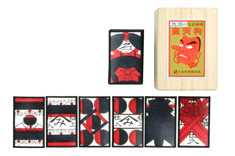 花札 復刻地方札 越後花裏赤(桐箱入り) 大石天狗堂 本体サイズ : 60mm×55mm×80mm その名の通り越後地方(現在の新潟地方)で使われていた花札。 昭和中頃まで普及していましたが花札メーカーの減少等によって失われてしまいました。 現在の花札より古いデザインで独特の絵柄から他の地域でも人気が高く、残っていた骨刷から復刻しました。 金、銀を使用した鮮やかな色彩が特徴です。 技法(遊び方)は現在の花札とほぼ同様です。 北海道へのお届けには別途送料440円を沖縄離島へのお届けには別途送料1200円を頂戴しています。北海道・沖縄・離島へのお届けには別途送料
