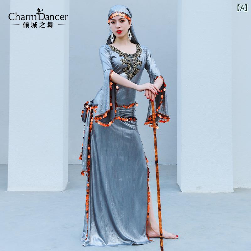 送料無料でお取り寄せします。ベリーダンス 衣装 セット レディース コスチューム ステージ パフォーマンス 発表会 サイディ ローブ スリット ラウンドネック ヘッド スカーフ スリム フィット エキゾチック グレー 赤 緑