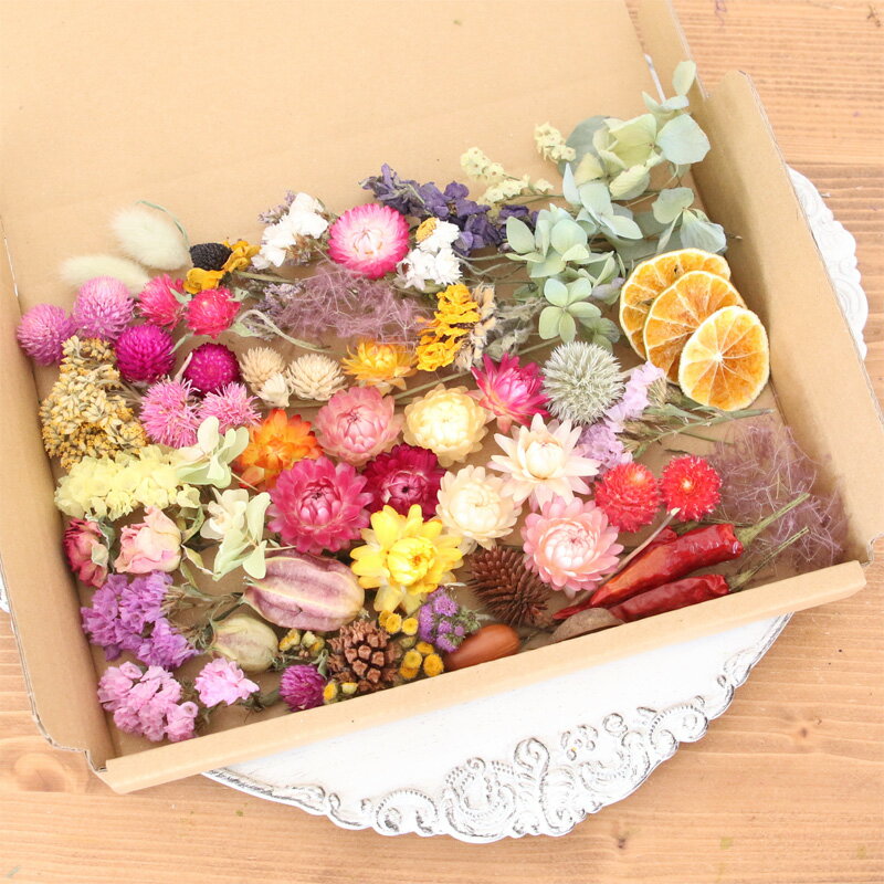 いろいろな花材をたっぷり詰め込みます!新鮮な生花をドライにしています。スターチス、ニゲラ、千日紅、ミモザ、かすみ草、スイートピー、ヘリクリサム、木の実、ドライオレンジ、SPバラ、ローリエの葉など...パッケージサイズ:約16×12×3cmの箱に花材をなるべくたくさんお入れします。ハーバリウム、レジン、キャンドル、サシェなど、様々なアレンジメントにお使いください。 ■サイズ パッケージサイズ:約16×12×3cm ■素材 ドライフラワー ■備考 ※少し押さえての発送になります。発送中に花落ち等する場合がございます。ご了承ください。 ※自然素材ですので、花や茎の一部取れ、欠け、色味の違い、くすみ、サイズ・容量個体差等見受けられる場合がございます。また、在庫状況により一部花材の変更、色味の変更をさせていただく場合がございます。ご了承ください。