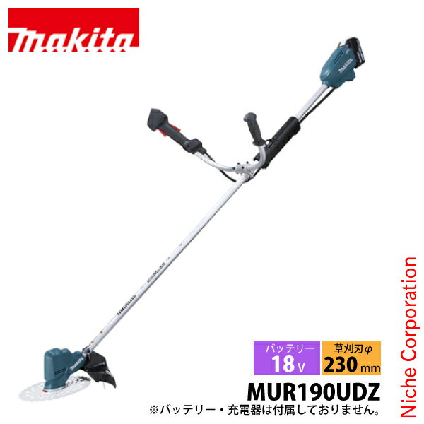 マキタ(makita) 18V 充電式草刈機 Uハンドル 本体のみ[MUR190UDZ]▼ツールレスで簡単刃物交換、22mLエンジン式と同等の使用感※2020年2月現在、マキタ調べ。マキタ22mLエンジン式モデル機比Uハンドル、230mmDCホワイトチップソー付■その他特長・樹脂3枚刃も使用可能(要別販売品)、スイングバック式で安心&シャープな切れ味・防滴・防じん「アプト」・カラミトリ機能・電気ブレーキ■対応する18Vバッテリは圧倒的な互換性チェンソー、生垣バリカン、運搬車、ファンジャケット、テレビ、保冷温庫、インパクトドライバ、マルノコ、スマートフォン充電、クリーナ、ライトなど280モデル以上に共通使用可能。 ■仕様【本体長】長さ1,836 × 幅635 × 高さ471mm (チップソー・飛散防止カバー含む)【質量】3.2kg (バッテリ含む・刃物、プロテクタ、肩掛けバンド等を除く)【標準付属品】 チップソー(刈刃)・飛散防護カバー・刃物(刈刃)カバー 肩掛けバンド・保護メガネ・ボックスドライバ 六角棒スパナ4・アクセサリバッグ【適応バッテリ】 ※バッテリを充電するには別売りの充電器が必要です。 ●18Vリチウムイオンバッテリ BL1860B、BL1850B、BL1850、BL1840、BL1830B、BL1830、BL1820B、BL1815N▼バッテリ・充電器セット商品のご購入はこちら▼バッテリ・充電器セット商品ページ※国内仕様のメーカー純正品です。並行輸入品・互換品・再生品ではございません。※安全に商品をご使用いただくために、マキタ製充電式製品には、マキタ純正のバッテリー・充電器をご使用いただきますようお願いします。なお、当店では模倣品、互換品のバッテリー・電池パック、リサイクル修理されたバッテリー・電池パックのご使用に起因する事故・故障につきましては、一切の責任を負いかねますのでなにとぞご了承ください。関連商品一覧ナイロンコード マキタ ウルトラメタルローラー4 (A-58241)18V バッテリ BL1860B (A-60464)18V用 充電器 急速充電器 (DC18RF)[ 伐木 伐採 林業 農林 マキタ makita まきた makita バッテリー バッテリー式 充電 充電式 電動 電動式 刈払い 草刈り 刈払 草刈 刈払い機 草刈り機 刈払機 草刈機 電動刈払い機 電動草刈り機 電動刈払機 電動草刈機 バッテリー式刈払い機 バッテリー式草刈り機 バッテリー式刈払機 バッテリー式草刈機 コードレス ワイヤレス ワイアレス 園芸 庭 ガーデニング 畑 家庭菜園 農作業 パワーツール 林業 林業用品 チップソー ナイロンカッター対応 ナイロンコード対応 樹脂刃対応 18V 18ボルト Uハンドル U字ハンドル U型ハンドル 両手ハンドル 両手 母の日 父の日 ]2022/04/22bt2 適格請求書発行事業者 【kk9n0d18p】