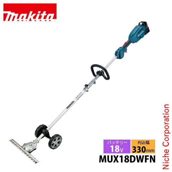 マキタ(makita) 18V 充電式スプリットグランドトリマ バッテリー ・充電器付き[MUX18DWFN]▼ヘッジトリマ刃のはさみ切りで草刈り時の石飛びを低減し、安心■特長●グラウンドトリマアタッチメント付モデルが登場充電式スプリットモータにグラウンドトリマアタッチメント標準付属・cfル。T字型の刃で草刈り刃物を左右に振らず、前方に推し進めるだけで刈込可能。 ●多目的工具スプリット豊富なアタッチメント(別販売品)で草刈りから枝払い、生垣の刈込み、耕うん、吹き飛ばし等、一つのモータで様々な作業に対応。※各先端アタッチメントの詳細は本機のアクセサリ(別販売品)をご参照ください。 ●アタッチメントは素早く簡単交換ロックレバーの操作で簡単に着脱出来ます。 ●ハイパワーブラシレスモータ搭載ブラシレスモータとコントローラを強制冷却。重負荷作業に最適。 ●最適重心バランスモータを後方にレイアウト。先端部が軽く、エンジン式同等の最適重心バランス。軽快な操作性を実現。 ●防滴・防じん「アプト」過酷な作業環境から本機を守り抜く。※注意:水や粉じんによって故障しないことを保証するものではありません。 ●農地、公園、駐車場等の草刈りに●対応する18Vバッテリは圧倒的な互換性草刈機、芝刈機、ブロワ、運搬車、ファンジャケット、保冷温庫、インパクトドライバ、マルノコ、スマートフォン充電、クリーナ、ファン、ライトなど300モデル以上に共通使用可能。 ■仕様【ハンドル部】形状:ループハンドル【刈込幅】330mm【ストローク数】 高速:2,000(min-1)[往復/分] 低速:1,400(min-1)[往復/分]【カット数】 高速:4,000(min-1)[回/分] 低速:2,800(min-1)[回/分]【電源】直流18V【1充電連続運転時間(無負荷時/目安)】 高速:約40分 低速:約1時間15分※数値は参考値です。バッテリの充電状態や作業条件により異なります。【本機寸法】長さ1,727×幅350×高さ241mm(※アタッチメント含む)【質量】5.4kg※バッテリ、EN424MP含む。【標準付属品】肩掛けバンド・六角棒スパナ4・アクセサリバッグ・ブレードカバー・保護メガネ・バッテリBL1830B(3.0Ah)×1本・充電器DC18WC【機能】 ハイパワーブラシレスモータ:〇 防じん・防水:APT AFT:〇【対応ポータブル電源】PDC01:〇※◎:推奨/〇:使用可※単電池1個当たりの体積エネルギー密度が400Wh/L未満のため、電気用品安全法の規制対象外となっております。別売品についてはコチラからお問い合わせください。[ マキタ MAKITA 正規販売店 まきた makita パワーツール 草刈り 芝刈り 草刈り機 草刈機 芝刈り機 芝刈機 充電式 バッテリー式 電動 ループハンドル ループ ハンドル トリマ トリマー グランドトリマ グラウンドトリマ グランドトリマー グラウンドトリマー T字 T字 T型 T型 ホイール タイヤ 車輪 刈込 草 雑草 農作業 ガーデニング ガーデン 造園 園芸 庭 農業 畑 田んぼ 田畑 道 空地 農地 公園 駐車場 多目的工具 多目的工具スプリット スプリット スプリットモータ スプリットシリーズ 330mm 33cm ]2024/04/30【kk9n0d18p】