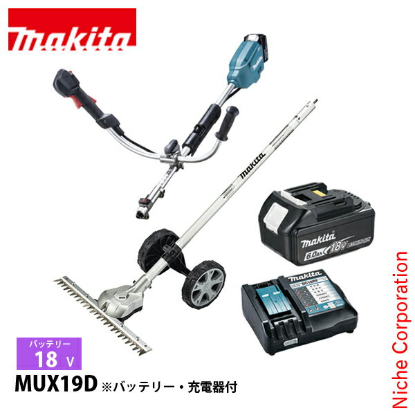 マキタ(makita) 18V 充電式スプリットUハンドル畦刈ヘッジトリマ バッテリー ・充電器付き▼▼▼セット内容▼▼▼マキタ 18V 充電式スプリットモータ Uハンドル モーター部のみ (MUX19DZ) ×1マキタ 畦刈ヘッジトリマアタッチメント コンパクトタイプ EN423MP (A-76037) ×1マキタ バッテリBL1860B (A-60464) ×1マキタ 急速充電器 (DC18RF)×1■■■マキタ 18V 充電式スプリットモータ Uハンドル モーター部のみ (MUX19DZ) ■■■平地に便利なUハンドル 「23mLクラス」※※メーカーエンジン式比■特長●多目的工具スプリットスプリットモータにUハンドルタイプ登場。推奨アタッチメント(別販売品)で草刈りや畦刈り、吹き飛ばし等、一つのモータで様々な作業に対応。23mLエンジン式クラスの使用感(メーカー比)。●横振り作業に適したUハンドルタイプ平地での横振りの多い作業に最適。草刈や畦刈などがラクな姿勢で作業できます。●ハイパワーブラシレスモータ搭載重負荷作業に最適なハイパワーブラシレスモータ搭載。 ●スピードコントロールレバー+単速トリガスイッチ前後に動かすことで無段階に変速可能なコントロールレバーを採用。アタッチメントや作業環境に応じた回転数へ簡単にコントロール可能。 ●キックバック時に刃物がストップ※キックバック(跳ね返り)を起こした時に発生する、急激な回転数の低下を検知し、刃物を素早く停止。※ 障害物に不意に当たった時に生じる跳ね返り。 注意:本機能はキックバックそのものを防止するものではありません。 ●防滴・防じん「アプト」過酷な作業環境から本機を守り抜く。※注意:水や粉じんによって故障しないことを保証するものではありません。(メーカー基準) ●ツールレスハンドルホルダ採用工具不要でハンドルの角度を調整可能。●スプリットなので持ち運びもラクラクハンドルをコンパクトに折り畳め分割できるので、車にもサッと積めて持ち運びラクラク。 ●アタッチメントは素早く簡単交換ロックレバーの操作で簡単に着脱出来ます。 ●畦刈ヘッジトリマアタッチメント畦の草刈りにEN423MP(角度調整式)部品番号 A-76037コンパクトタイプ1充電連続運転時間(BL1860B装着時/無負荷時/参考値)約1時間~約4時間20分(高速~低速)■その他特長●カラミトリ機能●定回転制御●主電源スイッチ+オートオフ●ソフトスタート&ソフトブレーキ●過負荷保護、発熱保護、過放電防止 機能付 ■仕様【モデルNo】MUX19D【ハンドル部】形状:Uハンドル【回転数】2,700~9,700min-1(回転/分)【電源】直流18V【本機寸法】長さ984×幅655×高さ451mm※BL1860B装着時。【質量】3.5kg※BL1860B装着時、肩掛けバンド除く。【標準付属品】 肩掛けバンド 保護メガネ 六角棒スパナ4 アクセサリバッグ【機能】 ハイパワーブラシレスモータ:〇 防じん・防水:APT エンジン換算クラス:23mL AFT :〇【対応ポータブル電源】PDC01【適応バッテリー】●18VリチウムイオンバッテリBL1860B、BL1850B、BL1850、BL1840、BL1830B、BL1830、BL1820B、BL1815N■■■マキタ バッテリBL1860B (A-60464) ■■■高容量リチウムイオンバッテリ18.0Vバッテリ容量 6.0Ah●残量表示機能付き●自己故障診断機能付き■仕様【充電時間】 DC18RE等→55分 DC18SD等→130分(2本同時)※使用する充電器によって充電時間が変わります。※充電器は付属しておりません【対応機器】インパクトレンチ、インパクトドライバ、ドライバドリル、マルチカッタ、マルノコ、チェンソ-ブロワ、レーザー、コーキングガン、クリーナ、ラジオ、テレビ、ライトファンジャケット、暖房ベスト、暖房ジャケット、ひざ掛け、空気入れ、コーヒーメーカーなどマキタ製の多くの機器に使用が可能です。届出事業者名:株式会社マキタPSマークの種類:PSE■■■マキタ 急速充電器 (DC18RF)■■■▼新・最適充電制御6.0Ah 「業界最速フル充電」約40分 ※2018年1月現在メーカー調べ充電中のバッテリ状態・周辺温度等を、充電制御へさらに反映し充電時間短縮。●対応14.4~18Vスライド式バッテリ対応■低温-10°C充電可能■連続急速充電可能■バッテリ冷却ファン■スマートフォン等が充電可能(USB)■充電完了メロディ付き♪※警告・ご使用前に取扱説明書を必ずよくお読みください。・バッテリの液漏れ・発熱・破裂の恐れがあります。マキタ専用の指定バッテリの充電以外には使用しないでください。・火災・関電・破裂の恐れがあります。雨中では使用しないでください。・故障の原因になります。昇圧器は使用しないでください。■仕様【生産国】中国【入力】100V~ 330W 50/60Hz【出力1】14.4V-18V直流 12A【出力2】5V直流 2.1A【適応バッテリ】 ●18Vリチウムイオンバッテリ BL1860B、BL1850B、BL1850、BL1840、BL1830B、BL1830、BL1820B、BL1815、BL1815N ●14.4Vリチウムイオンバッテリ BL1460B、BL1450B、BL14405、BL1430B、BL1430、BL1415、BL1415N【充電時間】※実用充電=80%充電 ※充電時間は目安です。 ●BL1860B、BL1460B 実用充電:約27分 フル充電:約40分 容量:6.0Ah ●BL1850/B、BL1450B フル充電:約40分 容量:5.0Ah ●BL1840、BL1440 フル充電:約29分 容量:4.0Ah ●BL1830/B、BL1430/B 実用充