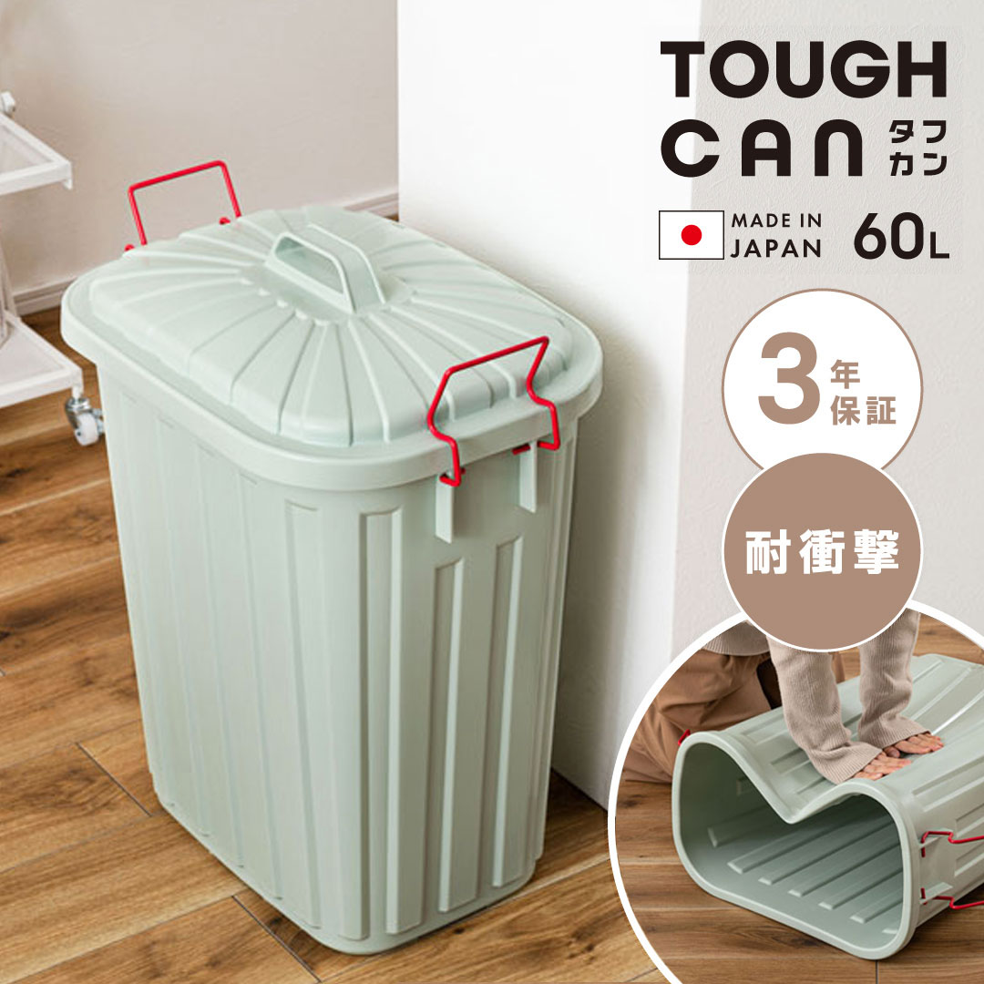 屋外でも使える60Lのタフなゴミ箱!日本製・3年保証付き! ●野外でも使用OKで、耐衝撃の丈夫でタフなゴミ箱“タフカン” ●衝撃に強く復元力のある大容量60Lのゴミ箱 ●ゴミ容器として正常なご使用状態で、万一割れ・破損が生じた場合の保証が3年付いた安心の日本製 ●やさしいカラーリングの本体と、ロックバーの配色も魅力的なアイテム ●ポリエチレン製なので柔軟性があり強い力で押しても復元 ●また、ポリエチレンは汚れに強くお手入れも簡単 ●60Lと大容量なので屋外作業のゴミ箱としても活躍 ●取っ手を持ち上げると、フタのロック機能に ●持ち運ぶときはロックが掛かった状態なので移動も安心 ●フタの片側には取っ手に付けられる『カバーセイバー』付き ●作業中にフタが飛んだり無くしてしまうことを防止 ●本体重量は約1.5kgと軽量なので持ち運びもらくらく 【仕様】 商品サイズ:約幅36×奥行55.4×高さ62.2cm 商品重量:約1.5kg 材質:ポリエチレン、スチール 生産国:日本 備考:完成品、3年保証付き ※商品画像は映り具合により、実物と多少色合いなどが異なる場合がございます。 ※品質向上のため、予告なくデザイン・仕様・カラーなどを一部変更となる場合がございます。 商品はカラー4種類!!■沖縄・離島へのお届けは中継料金が発生する為、お届けができません。 ■本製品はメーカー直送品となります。