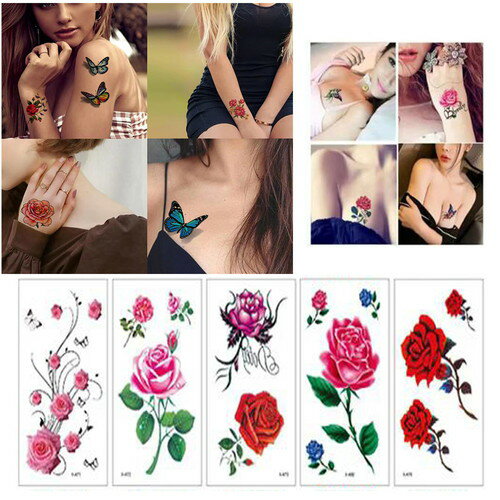防水長持ち!超リアルなタトゥーシール☆薔薇 5種各1枚の5枚セットタトゥーシール 5枚セット タイプ-B お得 タトゥー 防水 お花 フラワー 薔薇 蝶 かわいい ローズ ばら バラ 隠す リアル 長持ち カラー デカール シール おまけ付