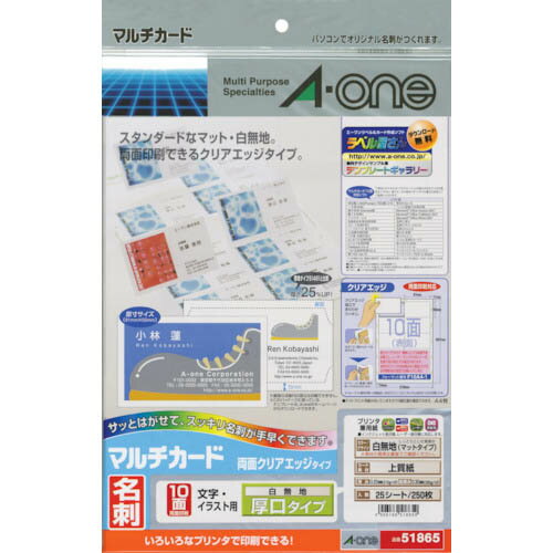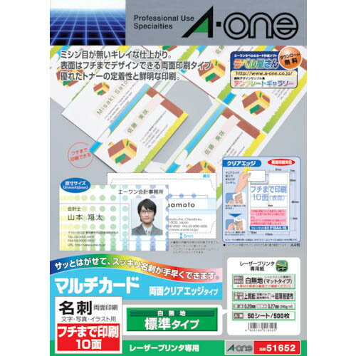 北海道・沖縄・離島へのお届けは別途送料がかかります。詳しくはこちら両面クリアエッジタイプ白無地標準厚み/材質:上質紙/標準総厚み:225g/(0.26mm)/カード厚み:0.18mmA4判フチまで印刷10面名刺サイズ/シートサイズ:A4判(210mm×297mm)/カードサイズ:55mm×91mm(2列×5段)対応プリンタ:インクジェット(染料・顔料)レーザーコピー熱転写ドット手書きスリーエム エーワン マルチカード 名刺 両面クリアエッジ フチまで印刷 500枚分 51672ゆうパケット制限数量以上の購入はこちら