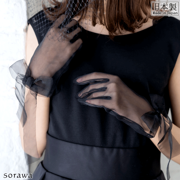 ふわっと結んだような揺れるリボンがきれい!【 メール便可 】 ふんわり オーガンジー リボン ショートグローブ グローブ 手袋 ブラック 黒 日本製 sg002 レース手袋 レース レースグローブ ウェディンググローブ ブライダルグローブ カラー 冠婚葬祭 フォーマル パーティー用グローブ 手袋 レースの手袋 ロリータ