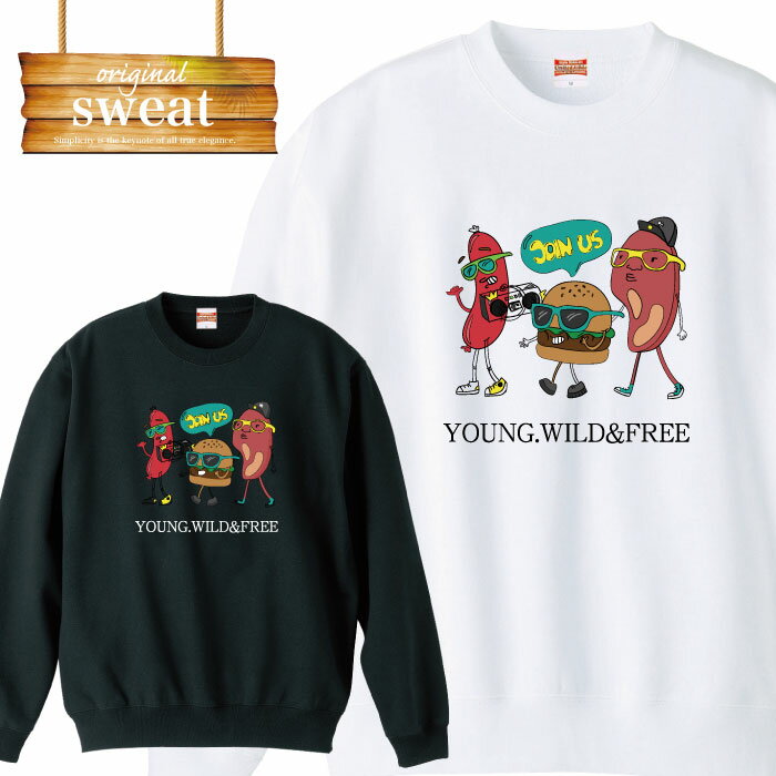 【 イラストデザイン・プリントスウェットトレーナー 】スウェット トレーナー 長袖 young wild and free ホテト ソーセージ デザイン プランド ストリート オリジナル 男女兼用 メンズ レディース アパレル 秋冬 裏パイル生地 S M L XL XXL 大きいサイ