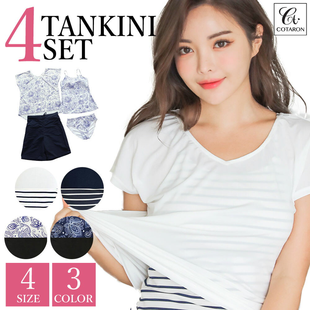 全て水着生地でできているので、そのまま水に入れます。 S M L LL XL ブラック ネイビー ブルー ピンク ホワイト ボタニカル エスニック バリ グアム ハワイ水着 レディース 体型カバー タンキニ キャミソール Tシャツ ショートパンツ 4点セット UVカット ボーダー ペイズリー 大きいサイズ 体型カバー水着 ママ水着 30代 40代 50代 オトナ女子 可愛い 人気 COTARON コタロン【送料無料】