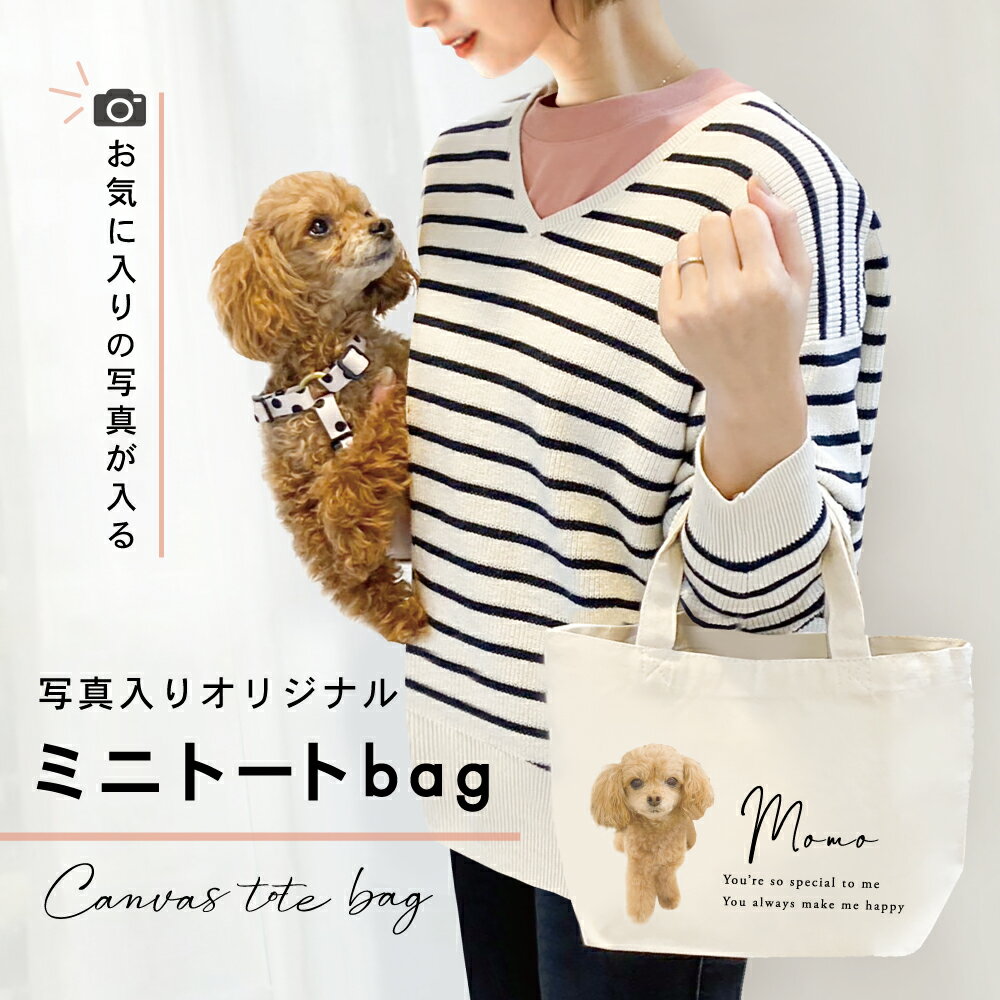 【商品紹介】 お気に入りのお写真をバッグに印刷♪ 愛犬とのお散歩、お買い物にも使えるキャンバスミニトートバッグ。 ちょどいい「コンパクトサイズ」 マチは約10cmあって、見た目に反して大容量。 生地は、耐久性のある、 しっかりとした厚手のキャンバス生地使用。 【バッグの印字内容】 3種類のフォントからお選びいただき、お名前がアルファベットで入ります。 ※1文字目は大文字になります。 【ご注文の流れ】 1 ご注文 2 ご注文確認 ( メール or LINE ) 3 写真到着後、制作作業 4 商品完成、発送完了 ( メール or LINE ) ※写真データは、LINEアカウント:@932ljkhx メール:akiko@kbe.co.jp 宛にご送付ください ※制作期間は、写真到着後から約14日営業日後の発送になります ※当社で1番良い状態にトリミングし制作します (仕上がりイメージを確認されたい方は、お申し付けください) 【商品詳細】 サイズ:約縦20x横30×マチ10cm 持ち手長さ:約幅2.5×長さ29cm 重量:約130g カラー:キナリ 【注意事項】 ・完全オーダーメイド商品ですので、注文後のキャンセルはできませんのであらかじめご了承ください。 ・使用時の破損や事故等につきましては責任を負いかねます。 ・サイズ・重量は、多少の誤差が生じる場合がございます。 ・お使いのブラウザや設定により、画像と実際の商品との若干の色の違いが生じる場合がございます。 ・洗う場合は手洗いし、濡れた状態で形を整えて日陰干しで乾かしてください。送料無料 名入れ無料 写真入り 写真プリント 写真入りギフト 名入れ 名前入り ネーム入り Name 誕生日 オリジナル オーダーメイド おしゃれ シンプル バースデー プレゼント ギフト 御祝い お祝い 贈り物 御祝 お祝 記念日 記念品 バレンタインデー ホワイトデー 成人式 七五三 母の日 父の日 敬老の日 クリスマス 入学 卒業 入園 卒園 お誕生日 内祝い お土産 手土産 御礼 結婚祝い 出産祝い 年賀 転職 ミニバッグ ミニトート ミニトートバッグ お散歩バッグ 鞄 小さい鞄 外出先 買い物 オリジナルミニトートバッグ ペット 犬グッズ 犬雑貨 ドッグ いぬ DOG
