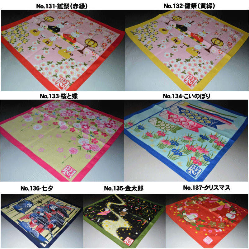 No.131-雛祭(赤縁) No.132-雛祭(黄縁) No.133-桜と蝶 No.134-こいのぼり No.135-金太郎 No.136-七夕 No.137-クリスマス サイズ49×49cm 綿100% 日本製