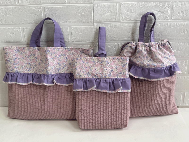 ハンドメイド 手作り子供用入園入学日本製5点セット【花柄】【フリル】ピンク ラベンダー【レッスンバッグ】 体操服袋 上靴入れ お弁当袋 巾着袋【手作り】【ハンドメイド】【入学】【入園】【子供用】【入学】【女の子用】【メルヘン】【日本製】☆おしゃれ