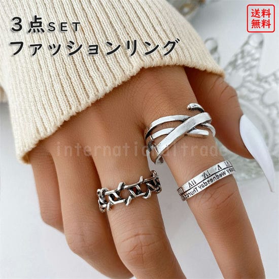 デザイン違いのリングが3点セットになったひと品。シンプルなものからデザイン性の高いものまでがセットになっており、これ一つで手元のアクセントは完璧です◎【ランキング受賞!】 アクセサリー リング3点セット メンズ レディース 指輪 ユニセックス ヴィンテージ シルバー おしゃれ 個性的 太め デザイン シンプル ストリート系 ファッション アクセサリー クール ボヘミアン ゴシック