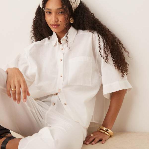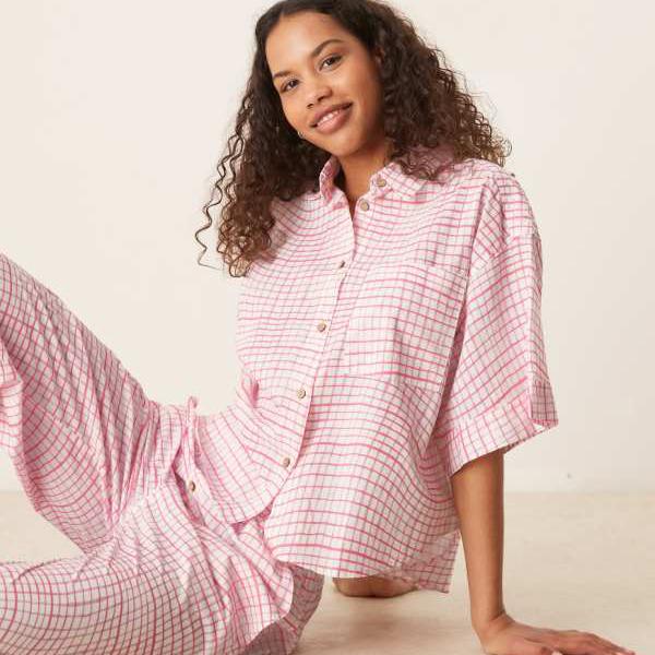 京都のセレクトショップdivaclosetエイソス ASOS asos ASOS DESIGNの、とてもソフトな半袖シャツとショートパンツのパジャマセット(グレーのコントラストパイピング付き) 部屋着 レディース 女性 インポートブランド 小さいサイズから大きいサイズまで