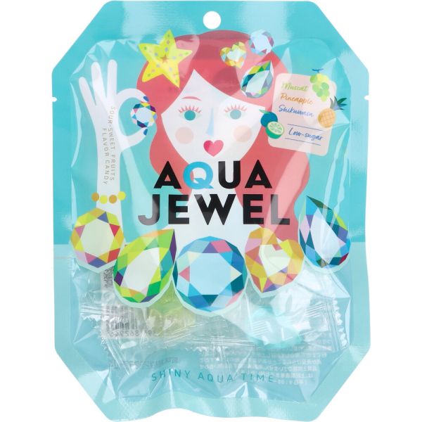 心を潤す甘酸っぱいフルーツの風味を閉じ込めた、キラキラと光る宝石型のローシュガーキャンディです。【メール便可能(2点まで)】AQUA JEWEL (アクアジュエル) 40g 【あめ 飴 キャンディ キャンデー おやつ 食品 フルーツ パイナップル マスカット シークヮーサー ローシュガー 宝石型】