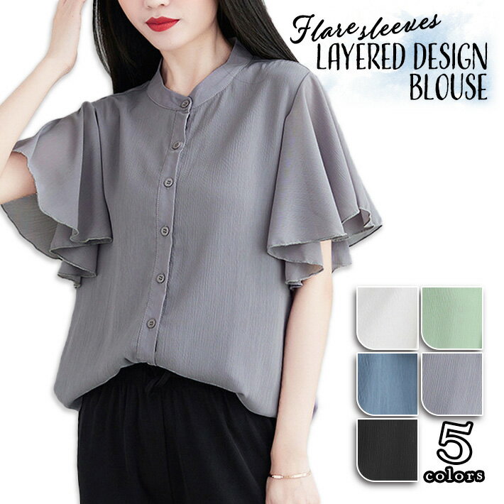 ふんわり可憐な印象のフリル袖楊柳シフォンが夏に涼し気丈差のあるレイヤード裾がお洒落なアクセントに 半袖ブラウス シフォンブラウス 楊柳ブラウス シャツブラウス【メール便で送料無料】【レビューを書いて10%OFFクーポンGET】涼し気 薄手 楊柳シフォン フレアスリーブ &レイヤード デザイン スタンドカラー 半袖ブラウス シフォンブラウス 楊柳ブラウス シャツブラウス フリル袖 涼しい 五分袖 春夏 夏 夏用 大人 30代 40代 レディース