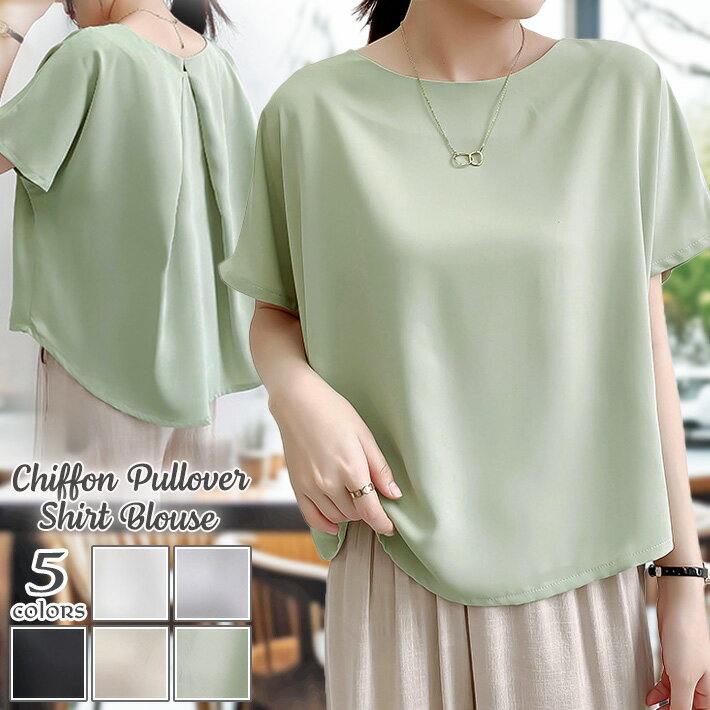 サラリと涼し気なシフォン素材バックタックのドレープがおしゃれゆったりと着やいAラインで体型カバーデイリーにもオフィスにも◎シャツブラウス オフィスブラウス【メール便で送料無料】【レビューを書いて10%OFFクーポンGET】シャツ ブラウス プルオーバー ノーカラー バックタック テールカット 涼しい 薄手 シフォン 半袖 オフィス カジュアル ビジネス OL ナチュラル きれいめ ゆったり 大きいサイズ 無地 春 夏 夏用 レディース