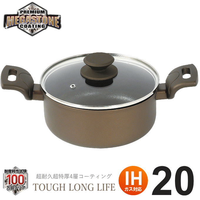 IH対応 ロングライフメガストーン蓋付両手鍋 20cm 商品説明 Premium MEGASTONE COATING 熱くなりにくいUPハンドル×変形しにくい強固なフチ×超耐久! 耐久性の高さがロングライフメガストーンシリーズがリニューアル。 ハンドル部分が握りやすく、より熱くなりにくい形状になりました。 ロングライフメガストーンIIは、耐久性に優れ長くお使いいただけるフライパンシリーズです。 ふっ素コーティングは超特厚4層。(特厚トップコート・特厚ミッドコート1・特厚ミッドコート2・特厚プライマーコート) 耐摩耗性試験100万回クリア※JIS S 2010に準ずる(塗料メーカー調べ) 金属ヘラも使用可能です。※角の丸いなめらかなものをご使用ください。 ご注意:オーブン・電子レンジには使用しないでください。 つけ置き洗いや食器洗い乾燥機には使用しないでください。 サイズ (約)全長34.5×幅21.5×高さ14cm 重量 (約)1.1kg 容量 (約)2.5L 材 質 ■本体:表面加工:内面/ふっ素樹脂塗膜加工、外面/焼付け塗装 素材・材質:本体/アルミニウム合金、はり底/ステンレス鋼、取っ手/フェノール樹脂(耐熱温度150度) ■蓋:品名/強化ガラス製器具、強化の種類/全面物理強化、つまみ/フェノール樹脂(耐熱温度150度)、つまみの座板/ナイロン(耐熱温度180度) 仕 様 オール熱源対応 キーワード 両手鍋 20cm 鍋 ih対応 ガス火 深型 20センチ ih ガス おすすめ 直火 おしゃれ くっつかない 取っ手 一体型 ソースパン マルチパン なべ ナベ 一人鍋 揚げ鍋 揚げ物 煮物 卓上鍋 万能鍋 炒め鍋 深い 深型 調理器具 ガス火 キッチンツール キッチン 調理器具 お得 お試し 調理道具 新生活 卓上 コンパクト シンプル キッチン雑貨 キッチン小物 キッチングッズ 一人暮らし 単身赴任 引っ越し おしゃれ ギフト 贈り物 プレゼント キッチン ツール おしゃれ 調理 料理 2023/12/11 仕様変更(ダイヤモンドコート→耐摩耗試験100万回クリア、プレミアムメガストーンコート)(ブラウン→カーキ)フライパンセット一覧 新生活におすすめ 便利な深型セット 4人家族向け 5人以上向け フライパン単品一覧 極深フライパン20cm フライパン20cm 極深フライパン24cm 極深フライパン26cm フライパン26cm 極深フライパン28cm フライパン28cm 玉子焼 フライパン30cm 蓋のご購入はこちら 鍋単品一覧 片手鍋 16cm 片手鍋 18cm 両手鍋 20cm 両手鍋 22cm ※仕様変更が随時行われます(ダイヤモンドコート→耐摩耗試験100万回クリア、プレミアムメガストーンコート)(ブラウン→カーキ)