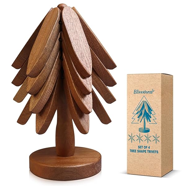 梱包サイズ:46.8cm 型番:1182025年木製ツリーデザイン鍋敷きセット – クリスマスツリー型収納スタンド付き、エレガン