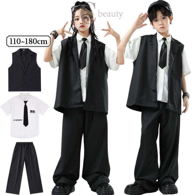 黒白 カジュアル系 子供スーツ キッズダンス 衣装 男女兼用 韓国 練習着 110-180黒白 子供スーツ セット ダンス衣装 キッズ ヒップホップ 衣装 ジャケット 袖なし ズボン 半袖 シャツ キッズダンス衣装 男の子 女の子 セットアップ ベスト ロングパンツ ストリート系 110-180