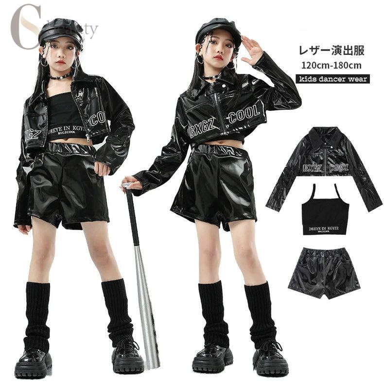レザー キッズダンス 4点セット 学生 子供 ダンス衣装キッズダンス レザー 4点セット ジャケット パンツ タンクトップ 女の子 子供服 黒 女の子 おしゃれ カジュアル 子供服 hiphop キッズダンス ヒップホップ ダンス衣装 チームダンス 120-180cm おしゃれ 小学生 中学生 チアガール