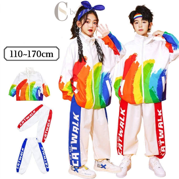 キッズダンス衣装 カラフル ジャケット 白 赤 青 長ズボン 長袖トップス ヒップホップカラフル 虹 ダンス衣装 キッズ ヒップホップ ウィンドブレーカー パンツ キッズ ダンス 衣装 練習着 トレーナー 子供ダンス衣装 セットアップ 男の子 女の子 ジャケット 長袖 ロングパンツ ズボン スポーツウェア ダンスウェア 110-170
