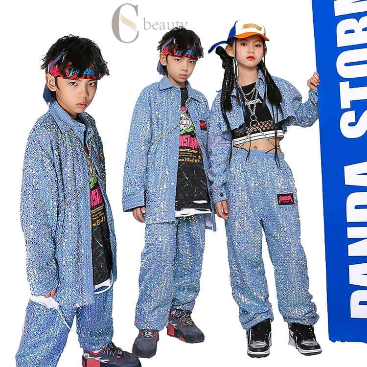キッズ ヒップホップ デニム スパンコール ダンス衣装 上下セット子供服 ヒップホップ ダンス衣装 男の子 デニム ジャケット パンツ 青 ブルー キッズ ダンス衣装 イベント お揃い セットアップ スパンコール キラキラ ダンス 衣装 女の子 K-POP ダンスウエア 長袖 ステージ衣装 jazz 派手 おしゃれ