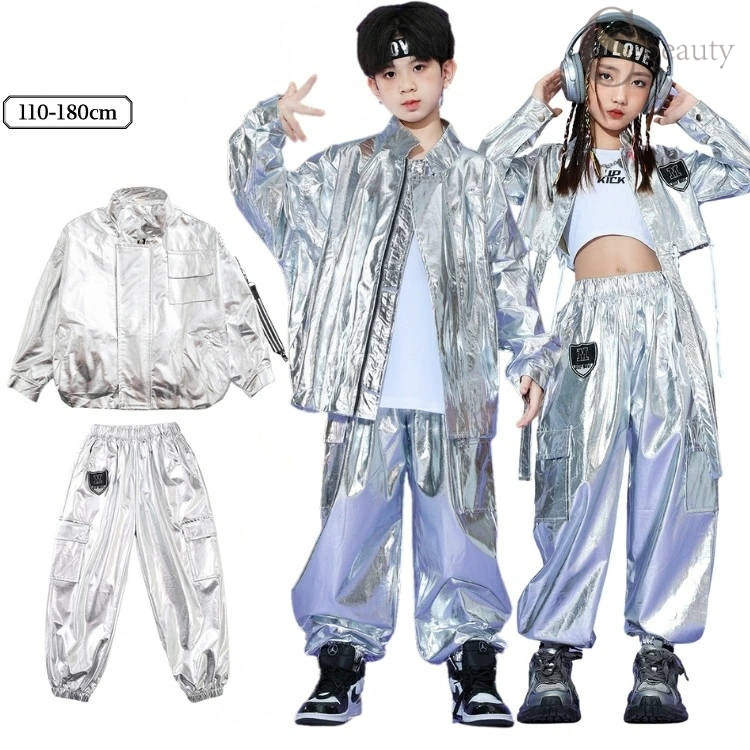 ダンス衣装 シルバー レーシング キッズ 男の子 上下セット HIPHOP ホワイト 女の子 韓国シルバー キッズダンス衣装 白 銀 レザー セットアップ ジャケット ダンス衣装 かっこいい 子供服 ヘソ出し チョッキ キッズダンス衣装 ストリート 男の子 長袖 シャツ 女の子 練習着 カーゴパンツ HIPHOP ダンス衣装 白トップス