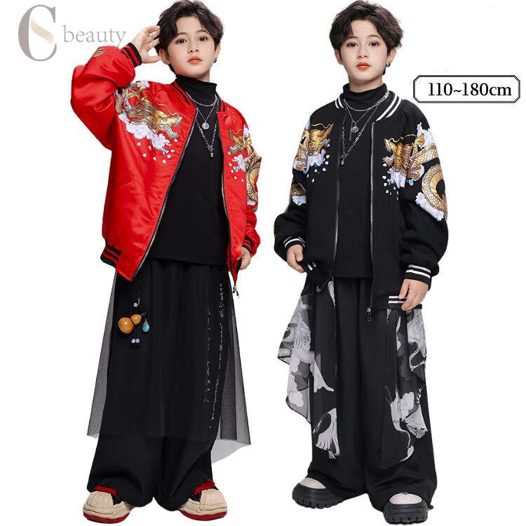 ダンスの発表会やコンテストなどのチーム衣装としておすすめ★キッズ ダンス 衣装 ヒップホップ スカジャン ジャケット 龍 フライトジャケット トップス 長袖 赤 黒 ズボン 中華風 ロングパンツ 黒 K-POP 子供 男の子 女の子 コート アウター 韓国 Hiphop 派手 おしゃれ 発表会 衣装 ジュニア 舞台服 演出服 カジュアル 文化祭