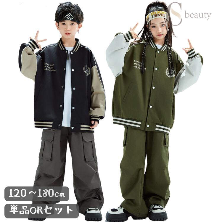 ダンスの発表会やコンテストなどのチーム衣装としておすすめ★キッズ ダンス 衣装 k-pop セットアップ 黒 グリーン ヒップホップ ベースボールジャケット トップス 長袖 カーゴパンツ 黒 グレー ズボン K-POP 子供 ダンス 衣装 野球服 子供服 男の子 女の子 韓国 Hiphop 派手 おしゃれ 発表会 衣装 スポーツウェア