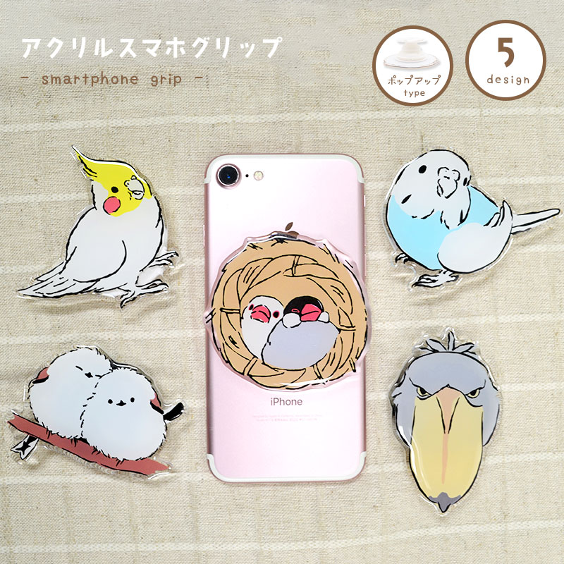 鳥さんのデザインがカワイイ★スマホグリップアクリルスマホグリップ ◆ゆうパケット対応◆ 小鳥グッズ 小鳥雑貨 スマホ 落下防止 スマホアクセサリー スタンド ポップアップ iphone アンドロイド スマホホルダー かわいい スマホグッズ セキセイ オカメ インコ ハシビロコウ 文鳥 シマエナガ【ことりすまいる】