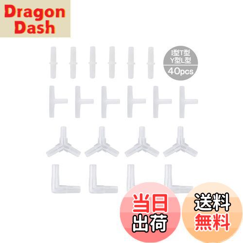 【送料無料】YFFSFDC エアーチューブコネクター 40個入り Y型/T型/L型/I型 水槽用 三又&二又分岐 チューブコネクタ 継手 アクアリウム 水族館 プラスチック製 透明色 4種類