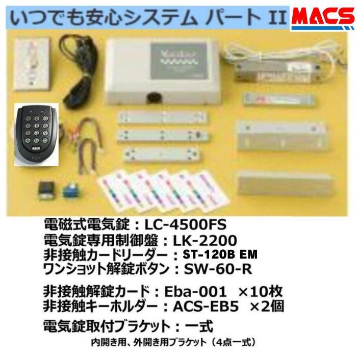 ◯製品特徴について ・VOLCALOCK電磁錠システムセット製品/スタンダードモデルです。 ・本セットで外開き/内開きの開き扉に電磁錠システムを構成・取付できます。 外開き BL-45FS-G10/K10 内開き BL-45FS-M05/Z30 が同梱 ・安心システムには外開き用、内開き用の取付金具が標準セット ・オプションの引き戸用取付金具「BL-4500L set2」で門扉/引き戸にも取付可能です ・LK-2200 は、電気錠解錠時間を0.5秒~約30秒まで設定可能 ・ST-720 は屋外対応。室外からは、カード/ タグをかざす暗証番号にて解錠できます (ST-720は、終売の方向です。ST-120 黒への機種変更してお届けいたします。) ・室内からは、SW-60A 押しボタン解錠スイッチにて解錠します。 (納品時は SW-60-R になります) ※組み合わせ関連機器 代表型式を以下に ご紹介しておきます。 ICカード Eba-001 ICキーホルダー ACS-EB5 接触式解錠スイッチ SW-60-R SW-20-R 非接触解錠スイッチ MSU-YH01 非接触式カードリーダー ST-120 ST-720 MRS-YEF03 制御盤 MCU-Y2200 電気錠 MDS-Y4500DLSS 通電金具 LG-036 電気錠セット品 安心システム ・注意事項:モニターの発色によって 色が異なって見える場合がございます。