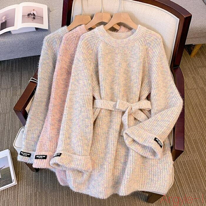 【送料無料】大きいサイズ 体型カバー フェミニン おしゃれ ゆっ【送料無料】トップス ニット セーター メランジ ローゲージ レディース エレガント きれいめ カジュアル 長袖 プルオーバー 大人 可愛い ウエストリボン 韓国 ベージュ ブル