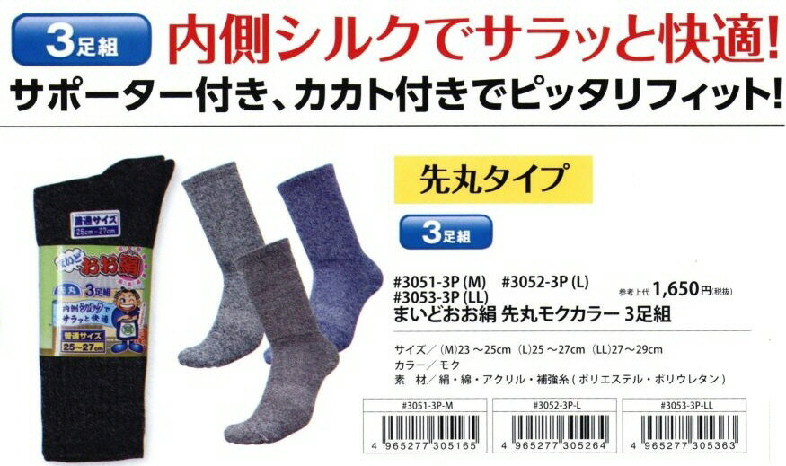 内側シルクでサラッと快適なソックス【作業・カジュアルソックス】福徳産業(ふくとくさんぎょう)まいどおお絹ソックス 先丸 モクカラー 3足組 3052-3P(L)【410】