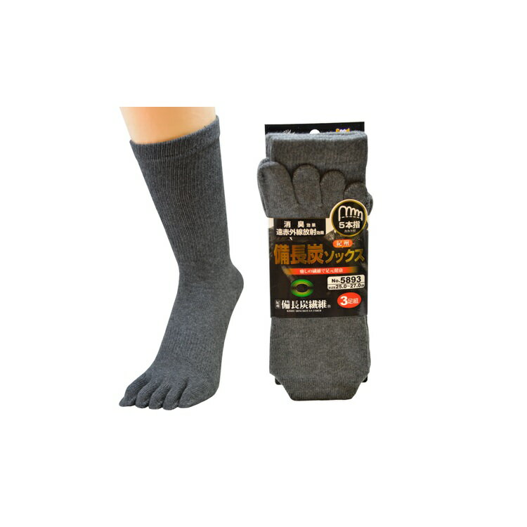 消臭効果!遠赤外線放射効果【作業・カジュアルソックス】FUJITE(富士手袋工業)紀州備長炭ソックス 5本指 カカト付 3足組(3P)サイズ:25~27cm 5893【410】
