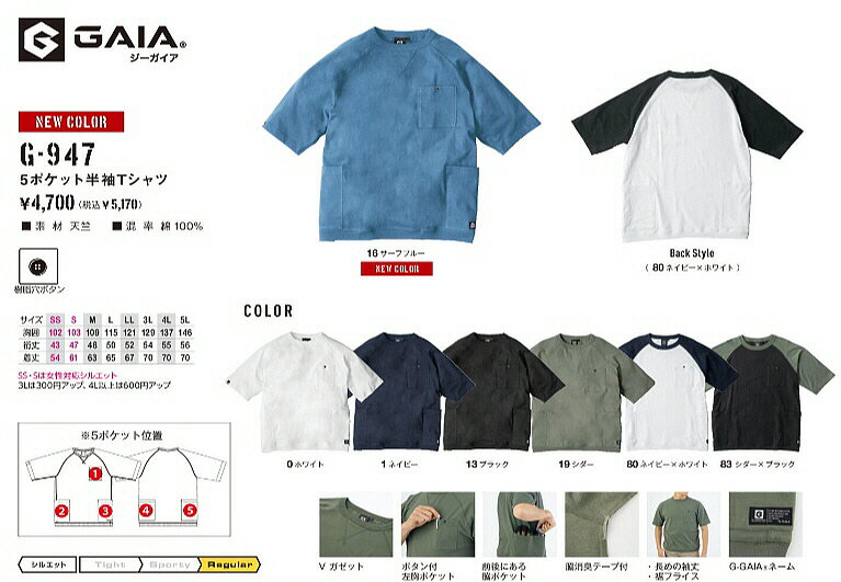 【メール便対応可】必要な物が収まる5ポケット付き【取り寄せ対応】【作業服】CO-COS(コーコス信岡)GAIA(ガイア)5ポケットTシャツ G-947【530】