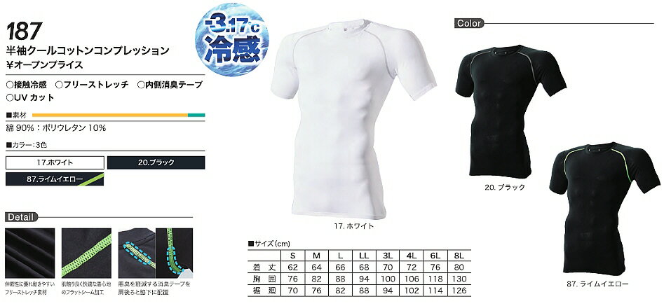 KURODARUMA 作業服商品説明 優れた吸汗速乾性、ストレッチ性、消臭性 で快適性をアップ。 ひんやりした肌ざわりの着心地で夏に 最適なインナーウェアです。 縫い目がないからラインが目立たず、 快適な着心地。 消臭糸を編み込んだ 生地と汗臭が気になる脇部分に 消臭テープを使用。 SEAMLESS 袖口・上腕に縫い目がないので着用ストレスを軽減 COLD TOUCH 接触冷感でひんやりした肌ざわりの着心地 STRETCH どんな動きにも対応するストレッチ生地 DRY 吸汗速乾機能でいつでもドライな着心地 DEODORANT 消臭糸を編み込んだ生地を不快な臭いを軽減 ナイロン80%・ポリウレタン20%、目付(160g/) 肌に直接触れる商品となりますので 衛生上、交換・返品不可とさせていただきます。 ※掲載商品の仕様、デザイン、生産国、発売時期は 予告なく 変更する場合がありますので、 あらかじめご了承ください。 ※掲載画像の色彩は実際の商品及び印刷物と 多少異なる場合があります。 ※メーカー希望小売価格はメーカーカタログに 基づいて掲載しています。 発送詳細複数ご注文、またはメール便対応商品をご注文の場合は、ショッピングモールからの自動メールでは送料は確定しておりません。店舗よりメールにて確定送料をお知らせ致します。こちらの商品の送料は下記のとおりです。 ご注文確定前に必ずコチラをご確認の上ご購入をお願い致します・ご確認ください・配送について・返品、交換について {カテゴリ} クロダルマ株式会社 KURODARUMA くろだるま 職人 工具 電動工具 道具 仕事 建築 建設 大工 工事 現場 工業 作業 高所 作業服 作業着 カジュアル ウエア アパレル トップス ズボン 上下 セットアップ 男性 メンズ シューズ くつ 安全靴 作業靴 長靴 ブーツ ハイカット ローカット 大人 一般 ユニセックス スニーカー ラバー 先芯入り ベルクロ マジック 農業 造園 運送 倉庫 サービス 水産業 林業 春夏秋冬 防寒 男性用 女性用 男女兼用 男性 メンズ 女性 レディース ヒート ベスト ワークウェア ワークウエア ワークベスト ジレ アウター ヒートベスト 電熱ベスト 発熱ベスト 冬用 軽作業 仕事着 現場服 寒い現場 寒さ対策 外せる 洗える 襟付き モバイルバッテリー 温度調節 着やすい かっこいい 大きいサイズ 小さいサイズ ポリエステル 野帳対応 業務用 スポーツ 自転車 サイクル ランニング ジョギング ウォーキング トレーニング フィットネス ジム 携帯電話 iPhone アイフォン スマートフォン スマホ アームポーチ アームバンド ウエストバッグ ウエストポーチ 腰 ヒップ スマートフォン ペットボトル ティッシュ 財布 散歩 3/4 スパッツ フィット インナー コンプレッション 練習 一般 着圧 吸汗速乾 ドライ 撥水 防水 吸湿 汗 サマー 夏 湿気 消臭 冷感 オールシーズン カットソー シャツ Tシャツ 長袖 半袖 ノースリーブ トップス アパレル ウエア パンツ ハーフ クォーター 帽子 キャップ カジュアル 靴 シューズ 靴下 ソックス 大人 一般 男性 メンズ ユニセックス ワークアウト ブラジャー スポーツブラ クロップド クォーター シャカシャカ ウィンド アウター ジャケット ウーブン ナイロン フーデッド ブレーカー 防寒 防風 裏起毛 冬 ウインター RUNNING JOGGING WALKING TRAINING SPORTS CYCLE CASUAL CAP MENS UNISEX ADULT ACCESSORY SHOES SOX TIGHTS SPATS INNER FIT COMPRESSION SHIRT T-SHIRT TEE TOPS SLEEVE SHORT LONG NOSLEEVE WEAR APPARREL PANT HALF QUARTER FITNESS POUCH WAIST HIP GOODS PETBOTTLE ARMBAND ARPOUCH LED LIGHT HEAD NIGHT CUT WORKOUT BRA WIND BREAKER JACKET JKT OUTER UBUN HOODED WORK DIY PIN TOOL SAFETY SHOES ADULT MENS UNISEX SNEKAER BOOTS APPAREL WEAR TOPS WINTER AUTUNN SPRING SUMMER OUTER VEST HEAT TECH