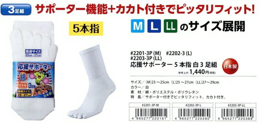 サポーター付きでピッタリフィット【作業・カジュアルソックス】福徳産業(ふくとくさんぎょう)応援サポーターソックス 5本指 白 3足組 2201-3P(M)【410】